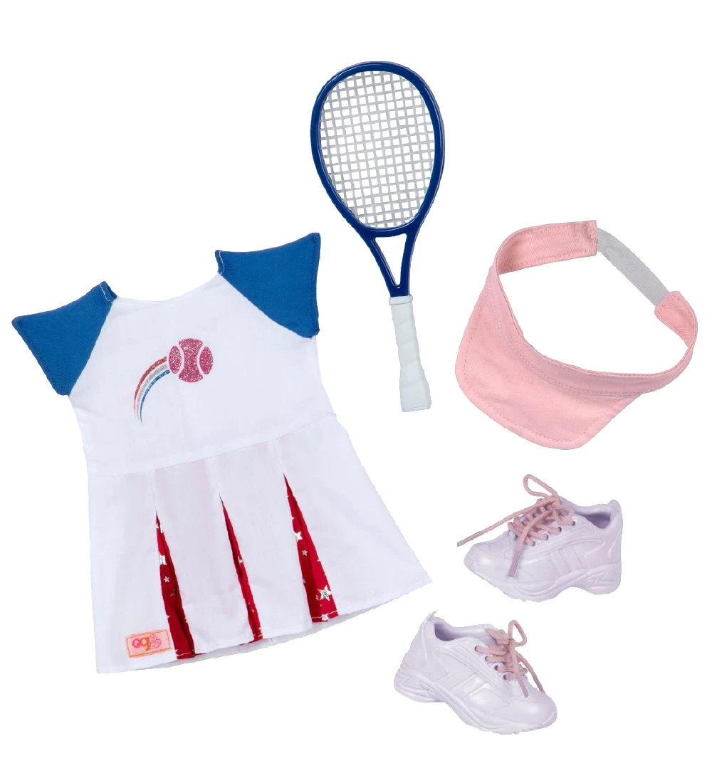 Fin Our Generation Imene dukke. Imene har brune øjne, der kan åbnes og lukkes, og har mørkebrunt hår, som nemt kan sættes. Hun er iført et skønt tennissæt bestående af en kjole i hvid, blå og rød. Imene har hvide sneakers på, og en bold og ketcher som tilbehør.