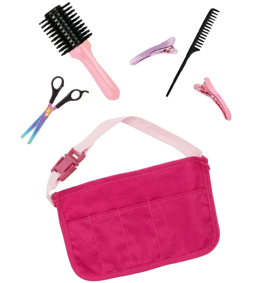 Der medfølger redskaber til en frisør herunder to klips til håret, en kam, en saks, en rund børste og et forklæde til de reskaber.