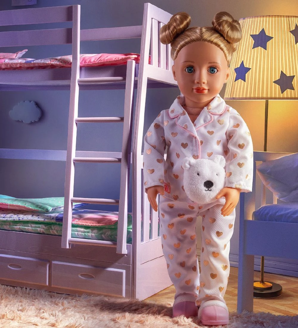 Fin Our Generation Serenity dukke. Serenity har blå øjne, der kan åbnes og lukkes, og langt, blond hår, som er opsæt i to knolde. Dukkens hoved, arme og ben er bevægelige, og hun er iført en hvid pyjamas med guld hjerter, et par rosa hjemmesko og en hjerteformet pude.