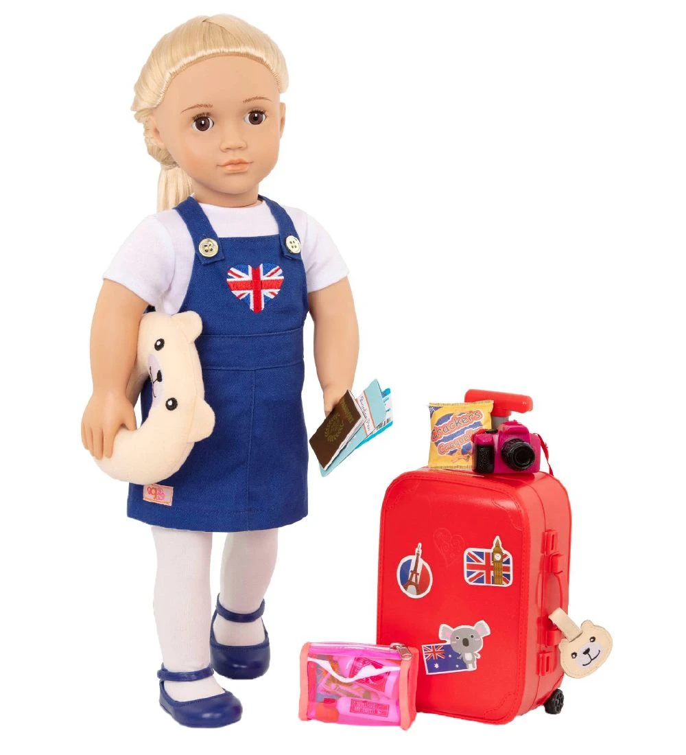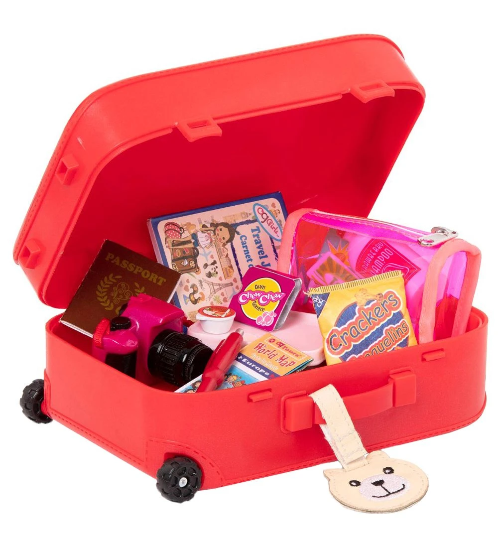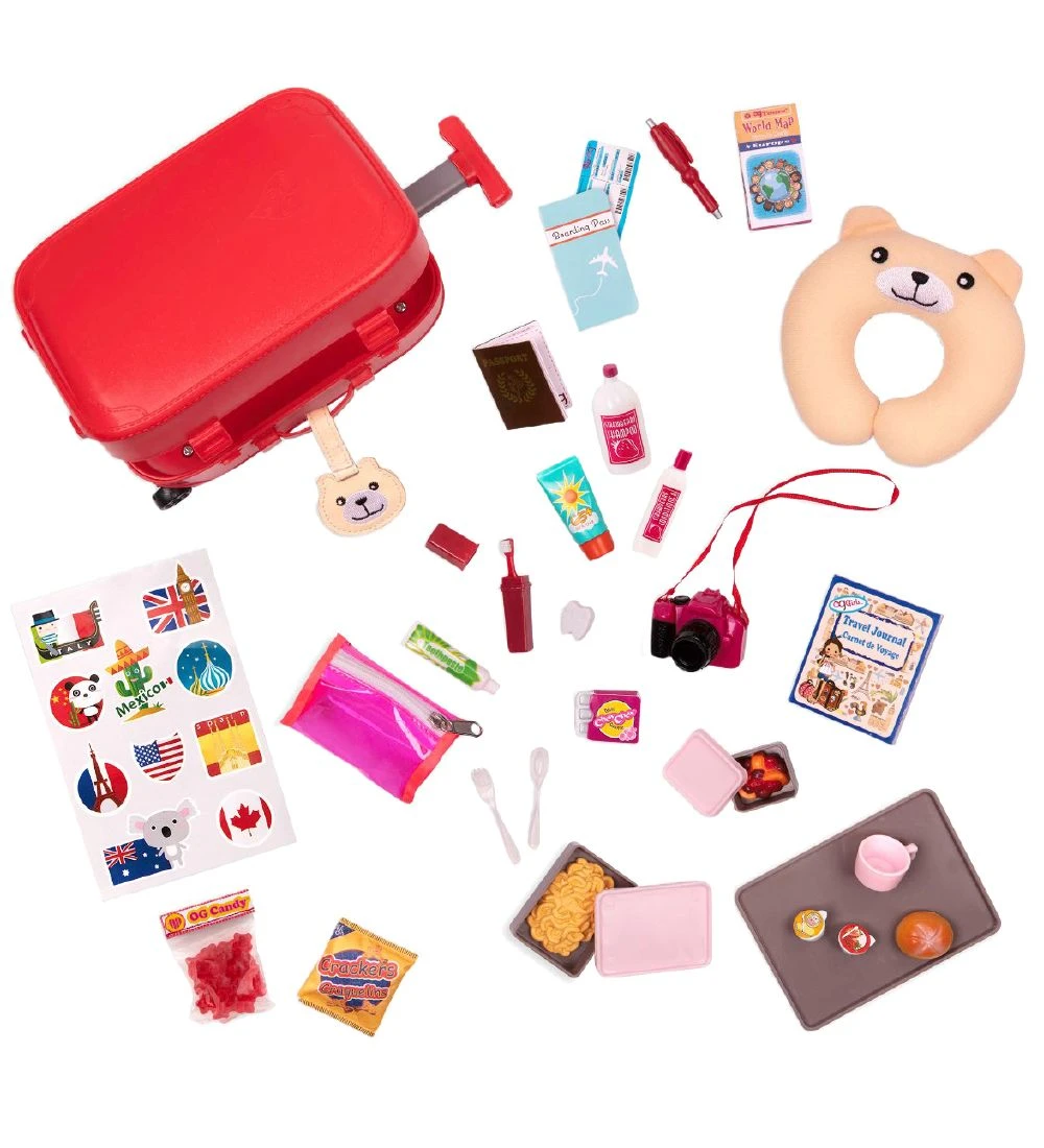 Our Generation sættet indeholder en madbakke, en makaronibeholder med låg, en frugtsalatbeholder med låg, et rundstykke, en kop, en gaffel, en ske, en smør, en marmelade, en tyggegummipakke, en slikpose, en pakke kiks, et verdenskort, et pas, en pasholder, klistermærker, en rejsedagbog, et kamera, en kuglepen, en rejsepude, et kuffertmærke, en toilettaske, en tandbørste, en tandbørstebeholder, en tandpasta, en pakke tandtråd, en tube solcreme, en flaske shampoo, en flaske balsam og en kuffert som alle tingene kan være i.