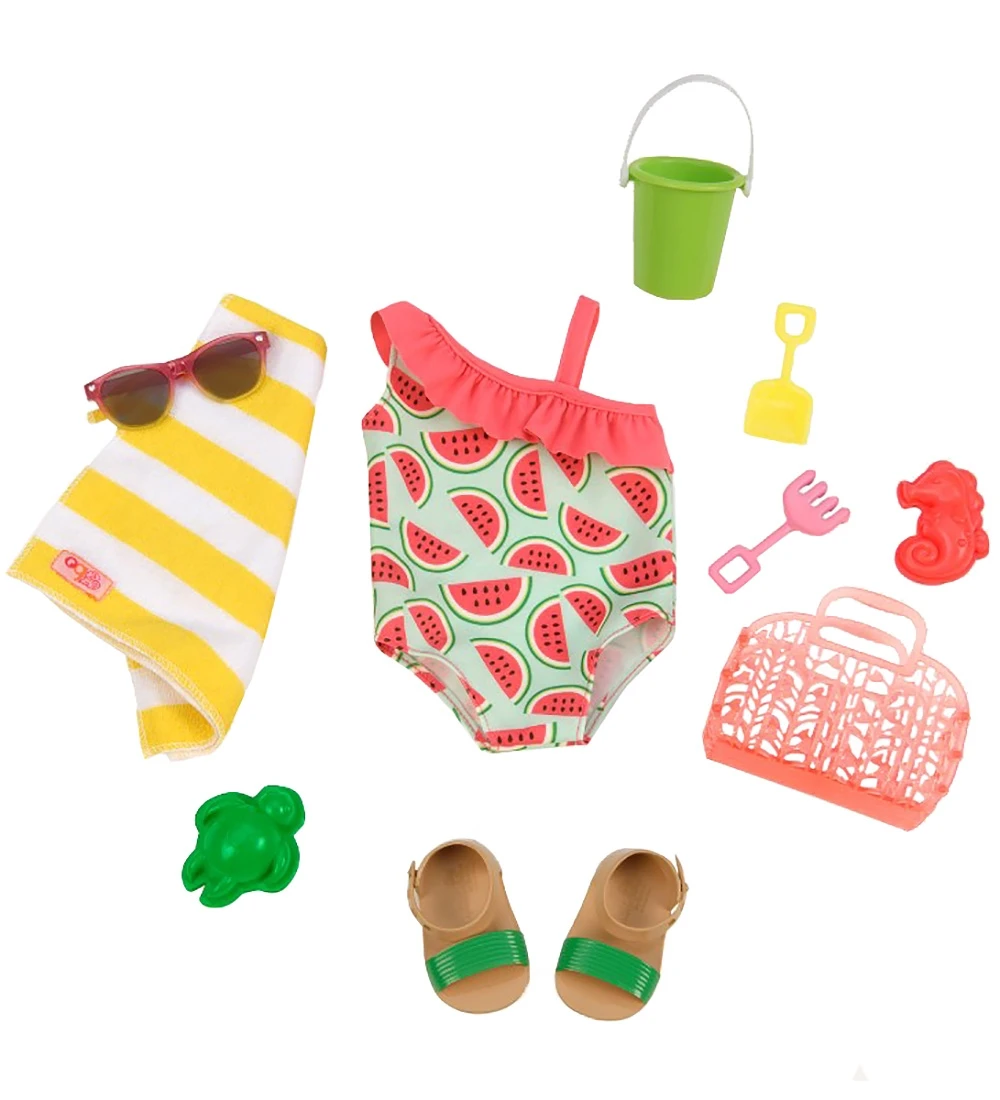 Skønt Our Generation dukketøj. Sættet består af en badedragt, en skovl, en strandtaske, et par sandaler, en spand, et strandhåndklæde, en rive, et par solbriller og to sandformer.