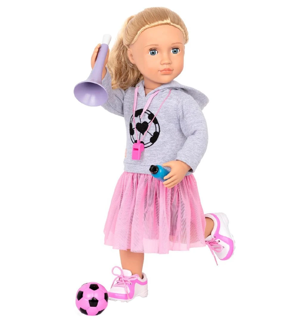 Sejt Our Generation dukketøj til at spille fodbold. Sættet består af en grå hættetrøje, en rosa nederdel og hvide sneakers.