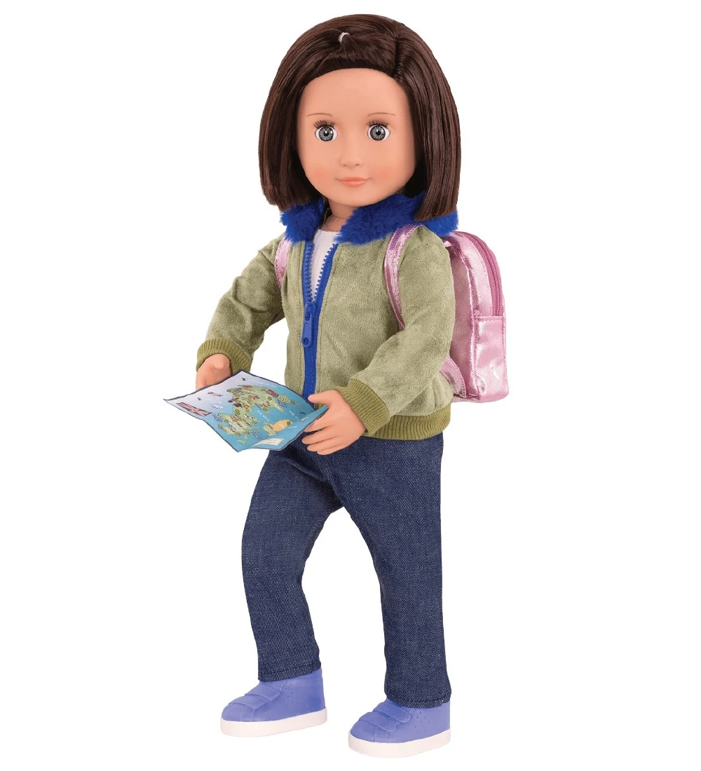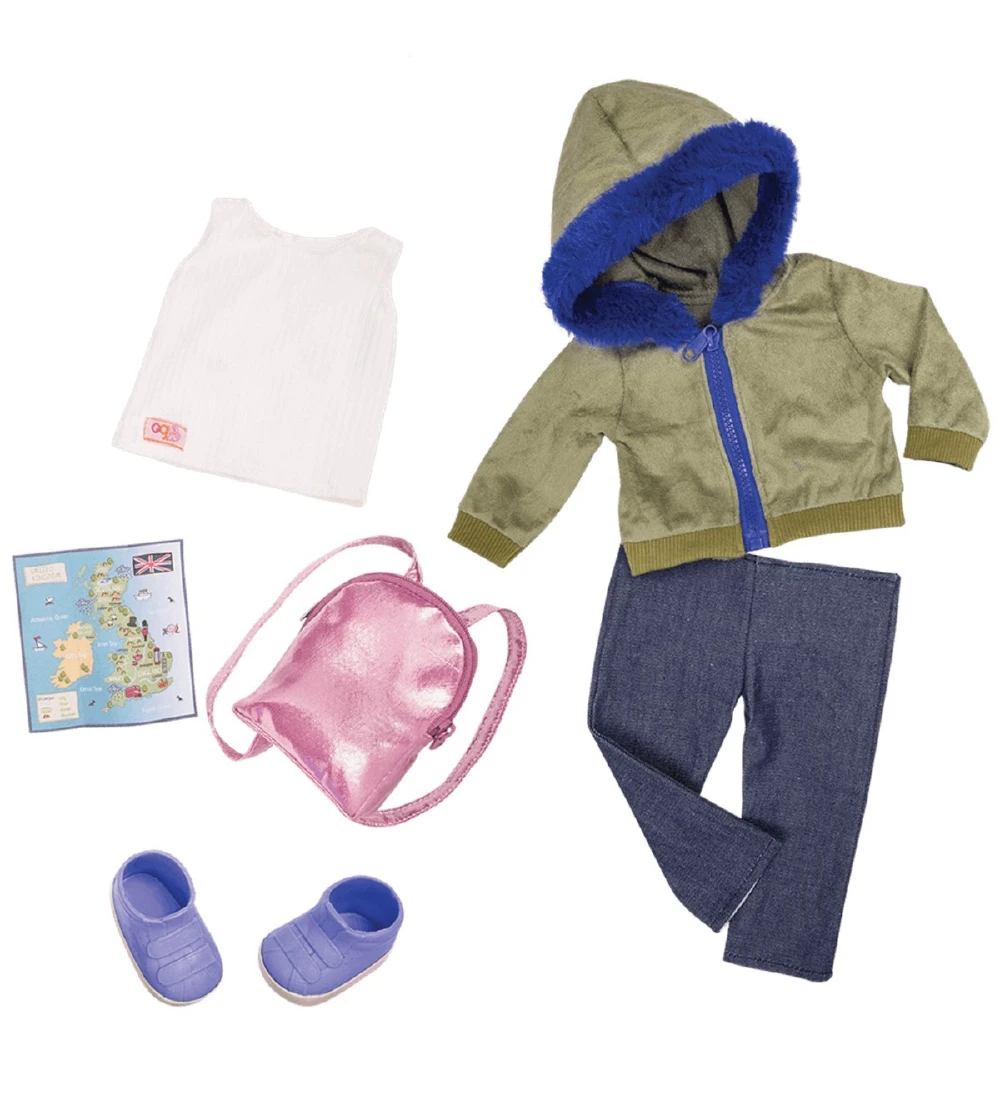 Flot Our Generation dukketøj. Sættet består af en top, en jakke, et par bukser, et par sko, en rygsæk og et kort.