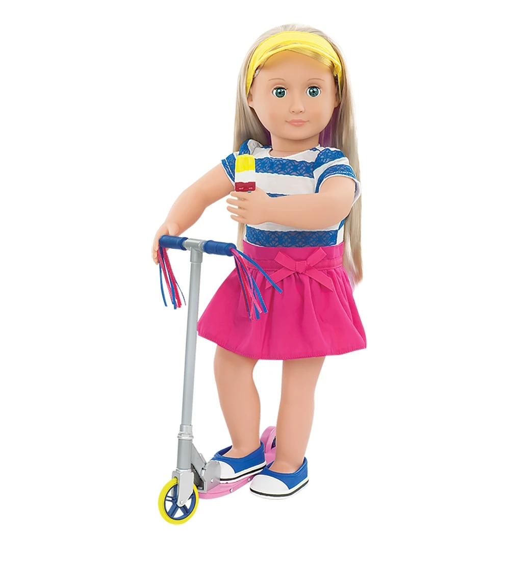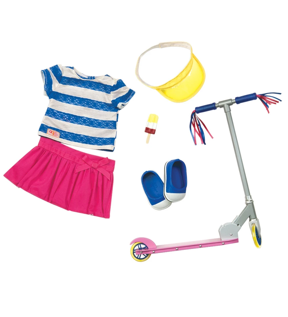 Skønt Our Generation dukketøj. Sættet består af smart solskærm, sko, rød nederdel, stribet top, en is og en lækker lyserød løbehjul.