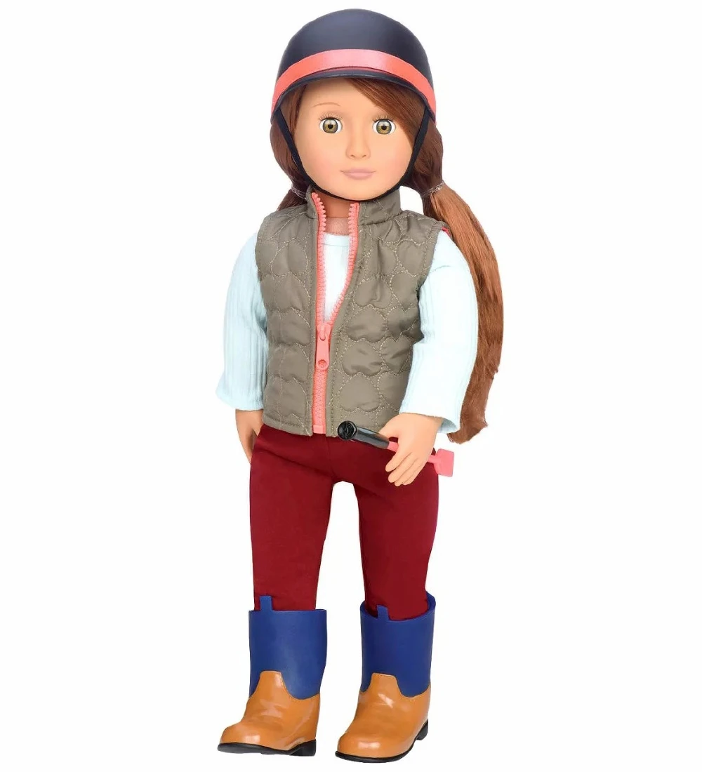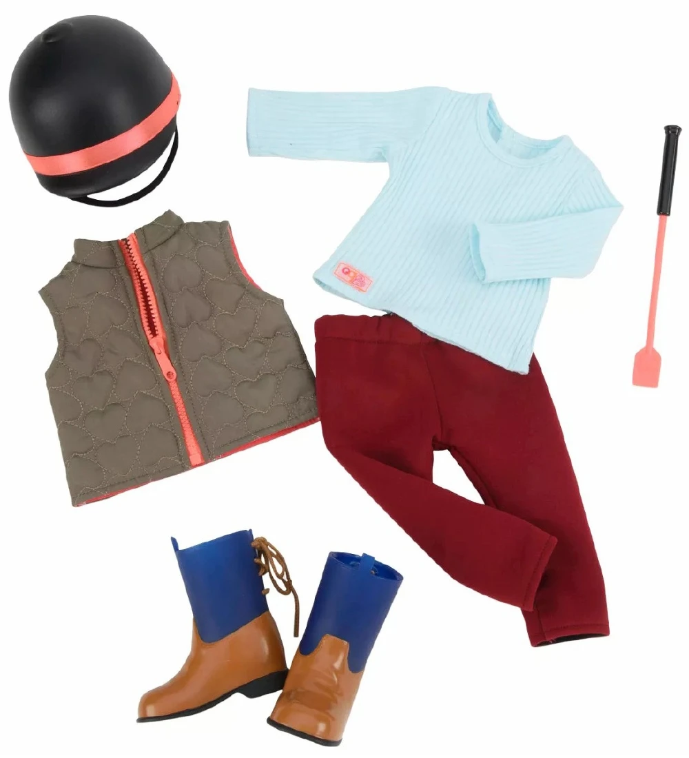 Flot Our Generation dukketøj. Sættet består af en vest, en bluse, et par bukser, en ridehjelm, et par støvler og en ridepisk.