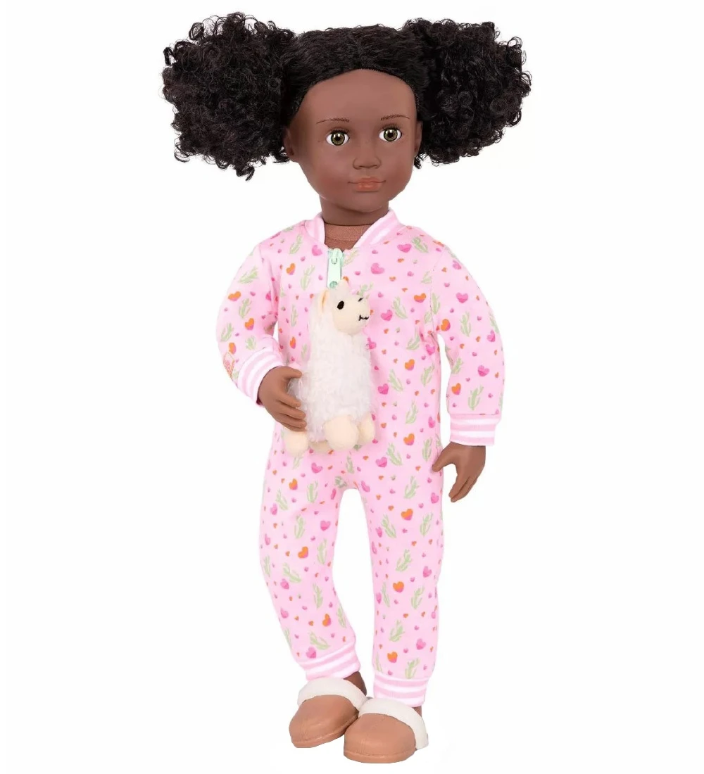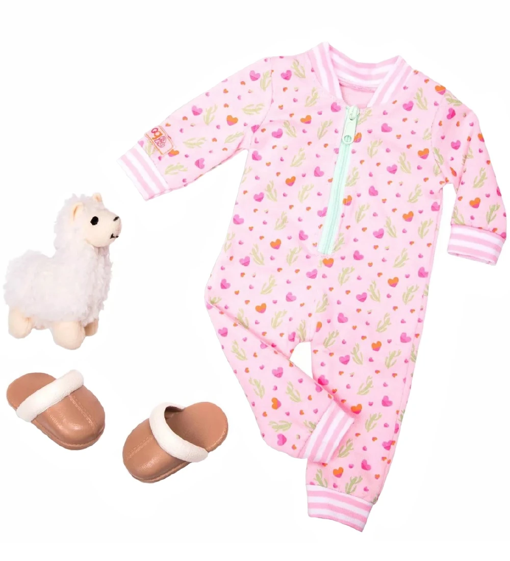 Flot Our Generation dukketøj. Sættet består af en pyjamas, et par sutsko og en lama bamse.