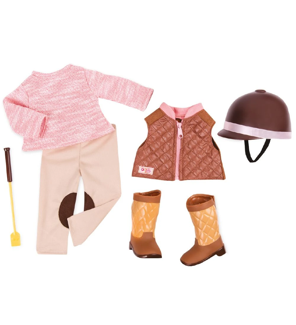 Sejt Our Generation ridetøj. Sættet består af en rosa bluse med en brun ridevest. Bukserne er lysebrune med mørkebrune patches ved inderlårene. Der er også flotte, brune ridestøvler samt en mørkebrun ridehjelm.