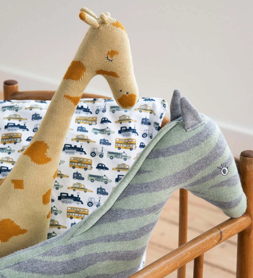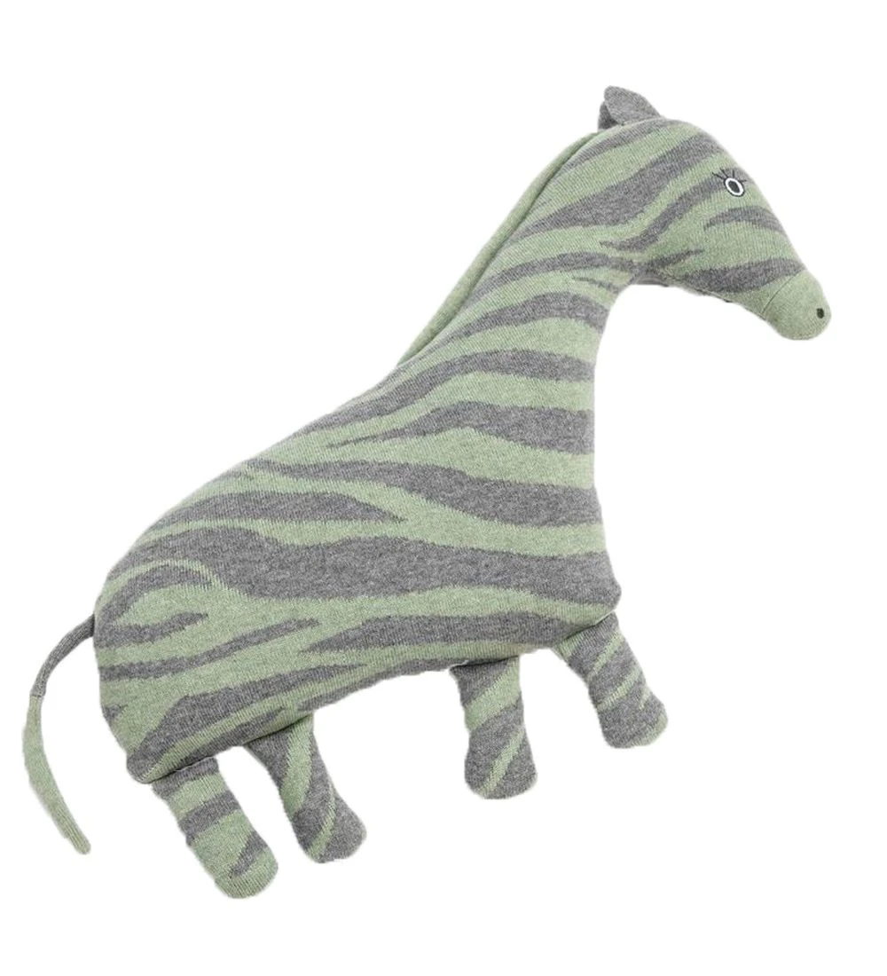 Dejlig Smallstuff bamse formet som en zebra i grå og grøn.