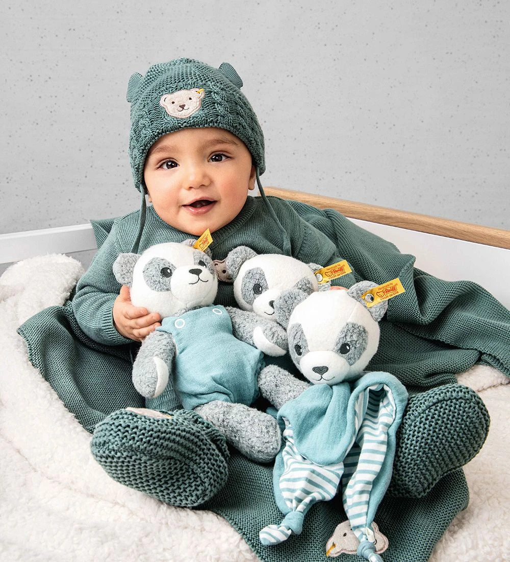 Skøn Steiff bamse i form af en panda i grå og hvid plys, med en petroleumsblå dragt.