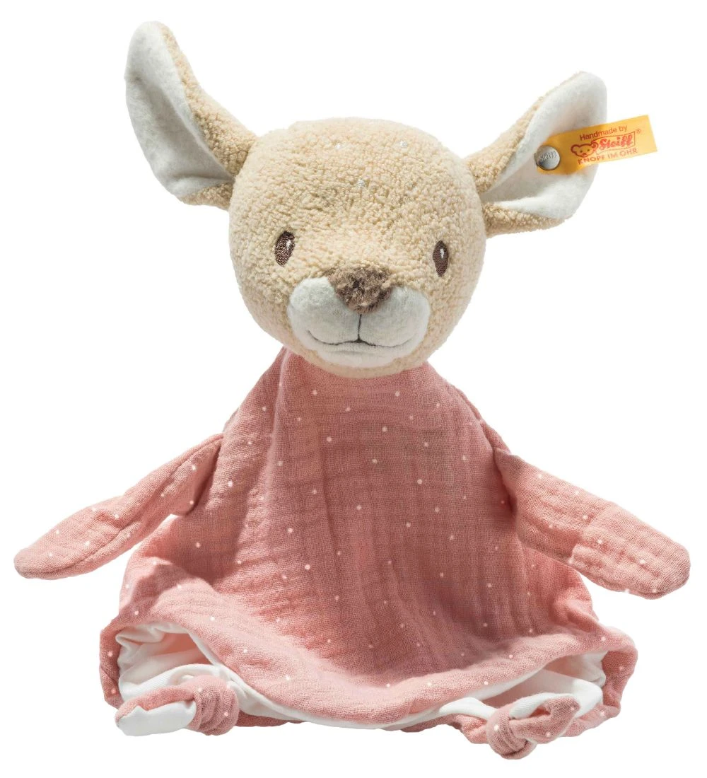 Fin Steiff nusseklud i pink, med form som et dådyr i brun.